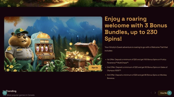 Notre promotion de bienvenue principale est une offre de bienvenue en 3 Packs Bonus, avec des crédits bonus en CAD et un total de 230 tours gratuits répartis en 100 + 50 + 80 tours gratuits. Chaque pack demande un dépôt minimum de 20 $CA et une exigence de mise de 35x. Nous affichons aussi une Offre de Démarrage à Faible Dépôt avec des crédits bonus en CAD plus 40 tours gratuits, un dépôt minimum de 1 $CA et une exigence de mise de 200x sur les gains. Aucun code promo n’est requis, et nous ne proposons pas d’offre de bienvenue distincte pour le sport ; ainsi, tout bonus GrizzlysQuest réclamé s’applique uniquement aux jeux de casino.