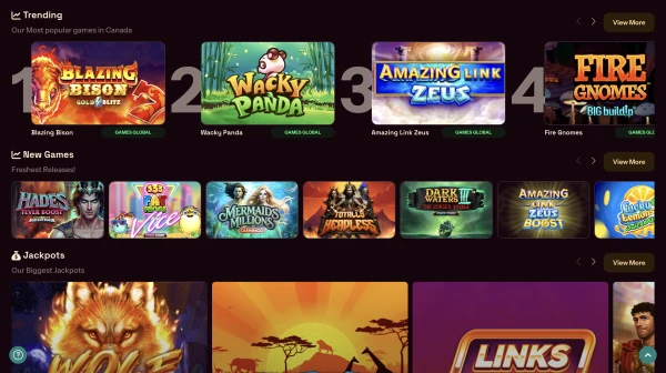Notre bibliothèque comprend 1 400 jeux répartis en quatre grandes catégories : machines à sous, jeux de table, casino en direct et jackpots progressifs. Vous pouvez filtrer par fournisseur, fonctionnalités et popularité, ce qui vous aide à trouver un style de jeu adapté à votre budget et à votre rythme. Si vous privilégiez les rouleaux, nous mettons en avant les machines à sous GrizzlysQuest aux côtés des nouveautés et des classiques de longue date de nos partenaires.